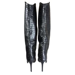 croc embossed boots, black knee boots, high heel boots, pointed toe boots, Maryana Schutz, crocodile leather boots, luxury boots, sleek heels, fall fashion, city chic, leather stiletto boots, designer footwear, runway style, Schutz Maryana