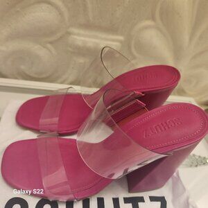 Schutz Pink Leather Block Heels. NWT. Size 8.5. No rips/stains or tears. The pink is leather. Cross over clear straps. Block Heel. Heel height: 4 inches. Comes with dust bag (has some dirt markings, nothing major).The only tags are description stickers on the bottoms, not the price tag. Smoke free home. No odors. All offers are welcome. Thank you!