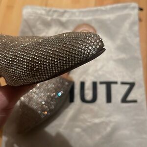 Shutz Rhinestone Pointy Toe Mule. Used but good condition, some scuffing on the toes, slight separation, slight rhinestone damage/missing ones. Size 7.5. Comes with dustbag
