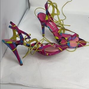 This is a gorgeous pair of Schutz Sz 8B Satin Pink Purple Leather Wrap Around High Heel Open Toe Sandals