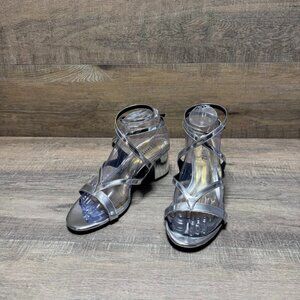 The Schutz Stephanie Block Heel Open Toe Sandal in women's size 8.5 is a stylish and elegant choice for any occasion. The silver color and gold tone hardware accents add a touch of sophistication, while the mid-height block heel provides both comfort and stability. The strappy design with ankle straps and open toe shape give this sandal a trendy and fashionable look, perfect for completing any summer outfit. Made from leather, this sandal is durable and high-quality, making it a versatile addition to any woman's shoe collection.