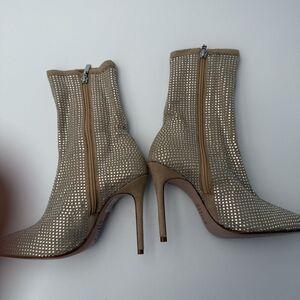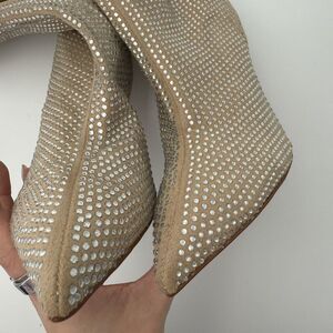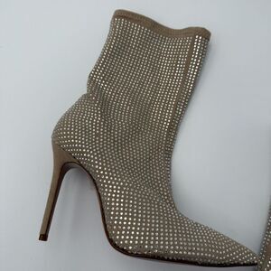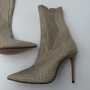 Schutz Sybil Rhinestone Fashion Mid Calf Tan Stiletto Bootie Heels Boots Size 7B