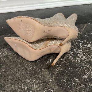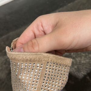 Schutz Sybil rhinestone and suede sock boots. Mid calf, light tan with crystal studs. Side zip with pointed toe. These are gorgeous boots! Never worn new without box. Have some adhesive? On the bottom that cannot be seen when worn and a few stones missing at the very top of the boot. They were purchased this way but not noticeable at all. Size 8.5B