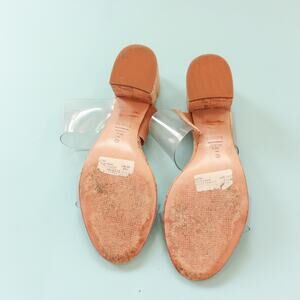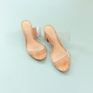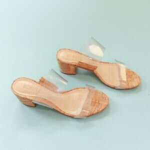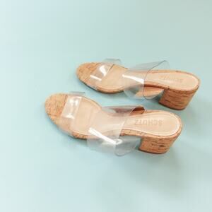 Schutz Victorie Leather Sole Cork Acrylic Clear Slip On Block Heels Size 7.5