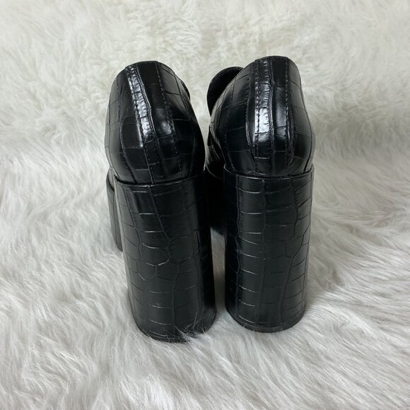 This is a pair of square toe, black leather, crocodile embossed, slip on platform loafers from Schutz. Some wear on foot beds and soles. 8.5B