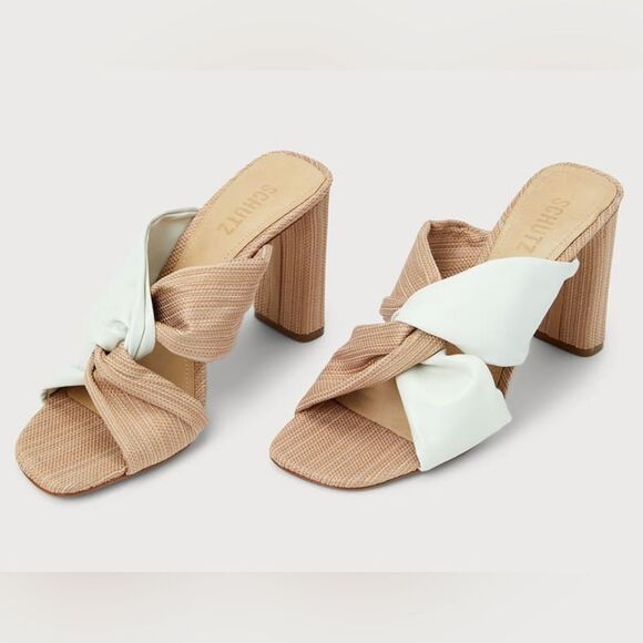 Make a statement with these Schutz Wendy Pearl and Beige Leather Color Block High Heel Sandals, size 9. Designed with a chic slide-on, open-toe silhouette, these heels feature a striking two-tone vamp crafted from smooth genuine leather and textured woven fabric in a unique interlocking design. Finished with a 3.5” wrapped heel and a lightly cushioned insole, they’re perfect for warm-weather styling, brunch, events, vacations, or nights out. In excellent used condition (EUC).