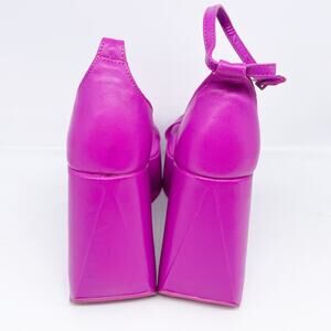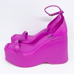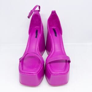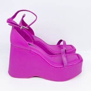 Elevate your style with these bold fuchsia platform wedges by Schutz. Featuring a sturdy ankle strap, they offer confidence and a fresh pop of color.