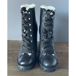 Plush faux fur lines a towering lace-up boot grounded by a towering heel and chunky lugged sole.