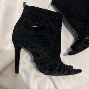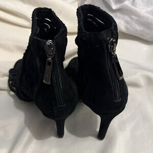 Moss green suede heeled bootie sandals. Open toe. Braided details. Back zipper closure. Includes dust bag.