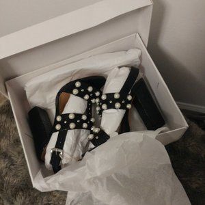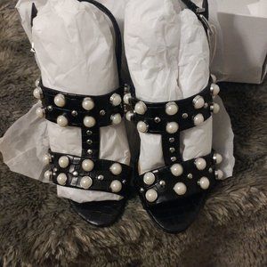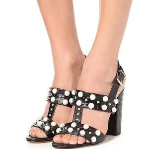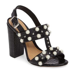 Schutz Zarita Faux Pearl Leather Slingback Sandals. IOB Size 6B. Worn once and in excellent like new condition. Chic textured leather sandals embellished with faux pearl details. Self-covered block heel, 4" high. Leather upper. Open toe. Adjustable ankle strap. Leather and man-made lining. Leather sole. Made in Brazil. Stunning statement sandals your wardrobe.