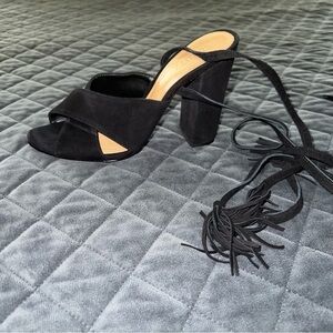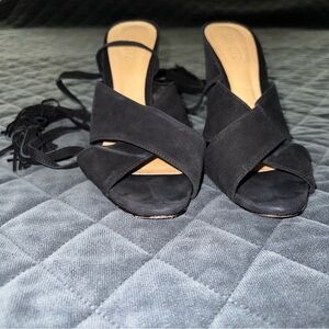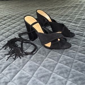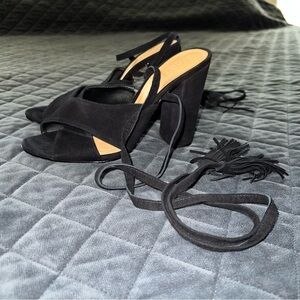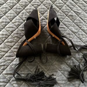 Schutz heels Women 8.5 Shoes Revolve Black Suede Tassel Block Open Toe Strappy