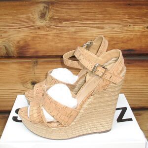 Ropes of braided jute wrap the modest platform and towering wedge of a breezy sandal topped with simple straps that link over the toe and buckle at the ankle.