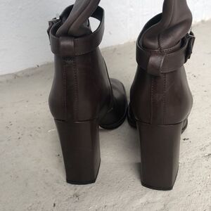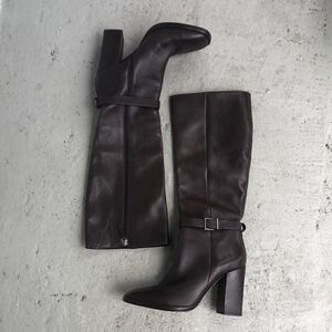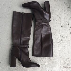 Chocolate brown leather tall boots that are in great condition check out the pictures. Shaft height is approximately 15 inches across the top is 7.5, heel height is 4 inches. They are also leather lined with leather soles and as you see from the pictures barely used.