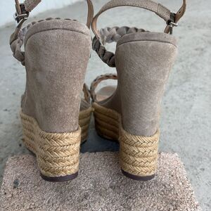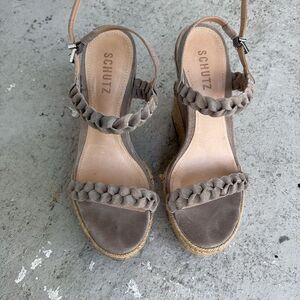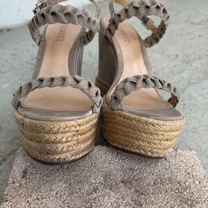 Please look at the pictures. These are suede and in good condition but the right toe needs some cleanup. Nothing serious. Platform height is 1.5 inches heel height is 5 inches. Color is like a taupe.