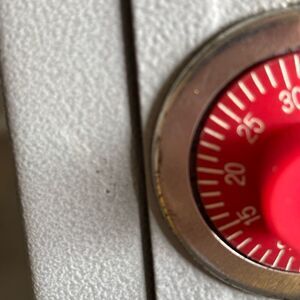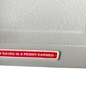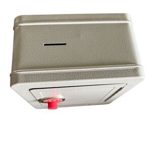 Schylling A Penny Saved Is A Penny Earned Combination Safe Alarm Bank. 8” high, 7” wide, 4” thick. Small scrape by dial. Penny saved label is loose. Combination taped to bottom. It looks like a stick was pulled off the back of the combination dial. Alarm works.