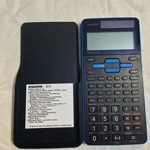 Blue scientific calculator with multiple functions and a clear display.