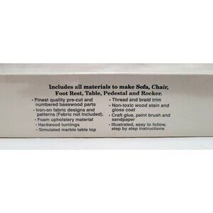 • Includes materials to make sofa, chair, foot rest, table, pedestal, and rocker