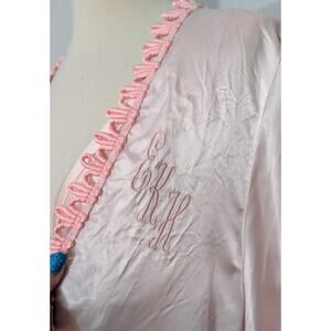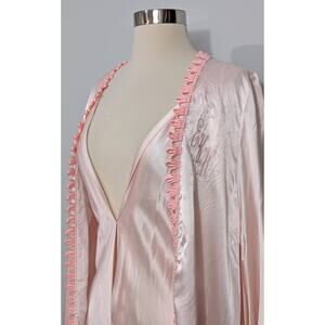This peignoir set is one of the most stunning garments I have seen. The deep V of the nightgown also has a little peekaboo beneath the closure. There's a trim that matches the robe that I can't decide if it goes in the front or back. The fabric is 100% acetate satin. There are embroidered initials that read EKH. This is bias cut which makes me think it might even be closer to the 30s. Gorgeous with no noted flaws.
