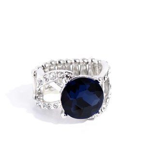 Glistening silver bars and white rhinestone-encrusted bands swirl across the finger, coalescing into an airy band. Featuring a regal faceted surface, a glittery blue gem is pressed into the center of the frame in silver-pronged fittings for a refined finish. Features a stretchy band for a flexible fit.