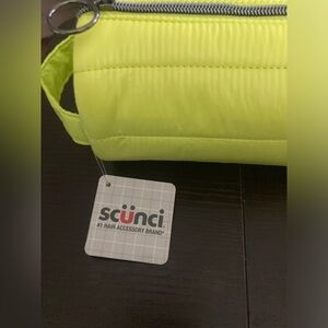 Scünci Neon Yellow cosmetic bag.9”x5”. In size.Zipper closure. Strap to carry