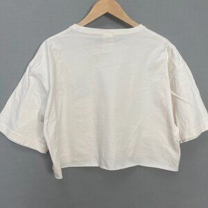 Size: Tag reads size large. Shirt has been cut off to a crop top. Estimating to fit as and listing as a relaxed fit women's size large. See approximate measurements for best fit.