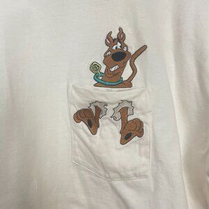 Scooby Doo short sleeve shirt with a DIY cropped length and embroidered pocket. White/cream colored.