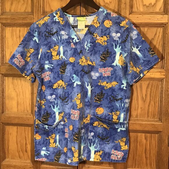 Scooby Doo Scared Silly, Scrub Top. Womens size Small, Blue, Short Sleeve, V-Neck, 4 Pockets, Cotton/Poly Scrubs.