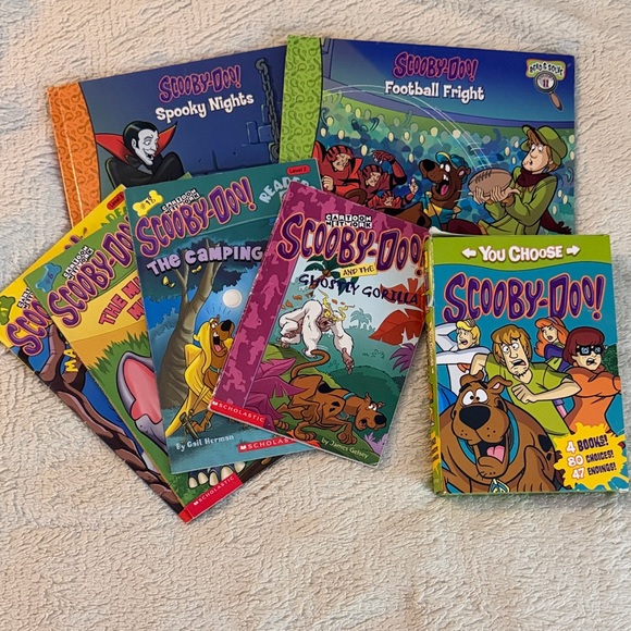 Set of Scooby-Doo books featuring colorful covers. Includes titles like 'Spooky Nights' and 'Football Fright.' Perfect for young readers. All are in good to excellent condition, boxed set includes 4 choose your own adventure style books. From a former Scooby doo loving young reader, hope they can find a new home!