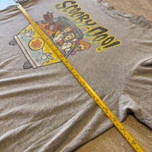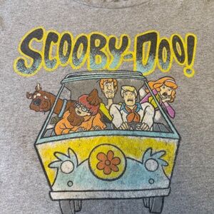 Classic gray Scooby-Doo short sleeve graphic tee featuring the full gang — Scooby, Shaggy, Velma, Fred, and Daphne — riding in the iconic Mystery Machine.
