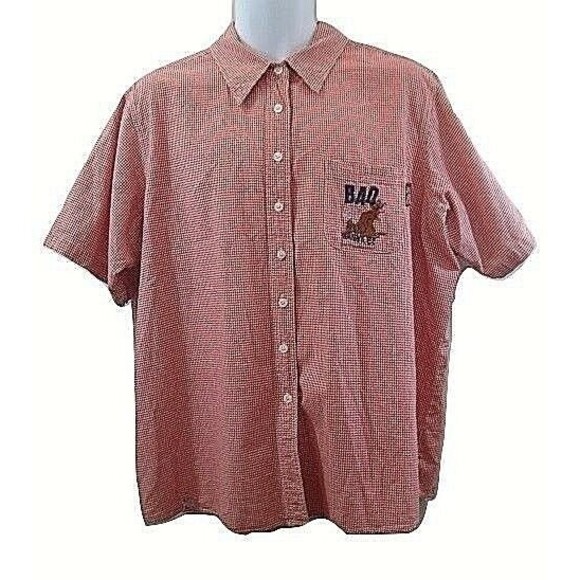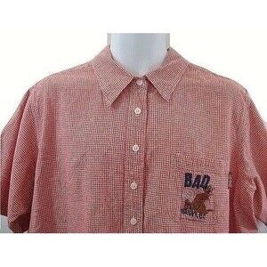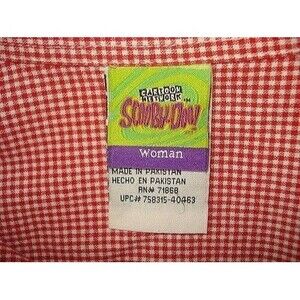 This is a Scooby-Doo Button Front shirt. Red checkered. Embroidered design on front left of Scooby that says Bad As I Wanna Be. There is a small hole towards the hem line. (See photos) See description below for measured sizes. Very good pre-loved condition. Refer to photos for additional information. Thanks for looking!