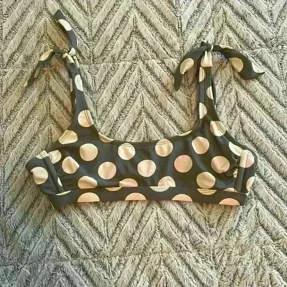 Scoop Neck Bikini Top Green and White Polka Dots size small. Worn a few times and in great condition. Has tie strings for the shoulders.