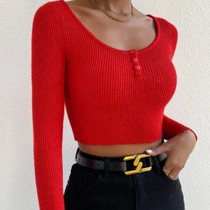 Scoop Neck Button detailed Cropped Rib-Knit Sweater top Red