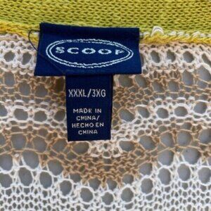 Crochet duster in vibrant chartreuse, khaki, and white. Perfect as a breezy cover-up for the pool or a chic layering piece for warm-weather outfits. Relaxed fit, pointelle knit, multi color long open front cardigan, Size XXXL Preowned in good condition-no rips or stains.