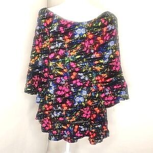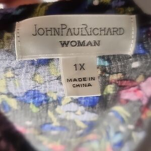 Scoop neck Blouse by John Paul Richard Floral Multicolor Size 1X, could be worn off shoulders, Ruffle Bottom, pit to pit 26", length 24", in good condition.