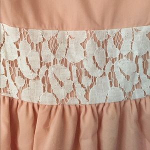 Cute blush dress with lace and tulle details has a scooped back. Perfect for weddings.