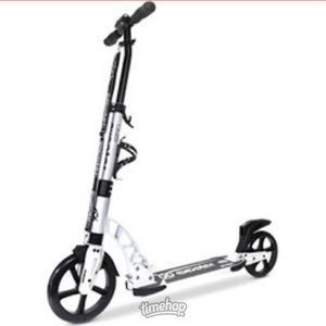Brand new scooter, rode it once for fun. It is in perfect condition. Its more for young teens as it’s a bit bigger. Makes it easier to balance because base is a bit larger, easy to fold for trunk use and travel