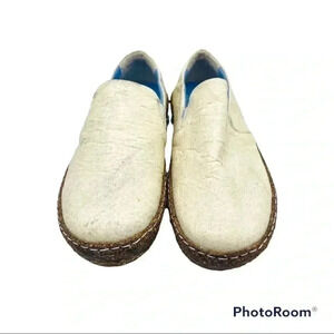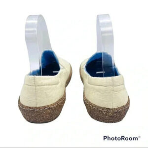 These slip on shoes are a cream or oatmeal color. Due to the compostable materials they are sturdy, but have a "paper" feel to the outside.