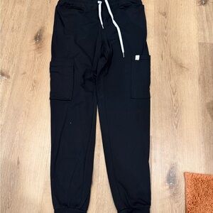 Size XXS top and XS jogger bottoms. Very soft material, feels like thick lululemon material.