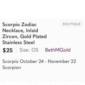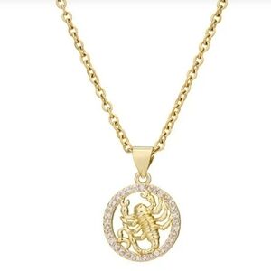 This gold tone necklace features a Scorpio pendant with zircon accents, making it the perfect accessory for astrology lovers. Add a touch of celestial charm to your outfit with this piece.