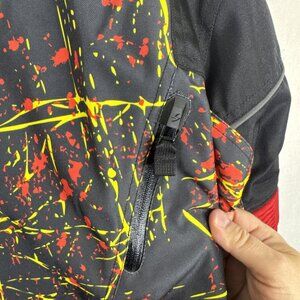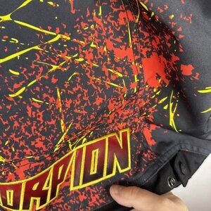Men’s Scorpion EXO “Departed JKT” motorcycle jacket. Size L. Water-resistant shell with bold red/yellow graphic design, Scorpion logos, and protective construction. Features zip-out removable liner (KwikWick moisture management), multiple pockets, full-zip front, and adjustable waist. No rips or holes noted. Minor wear from use.