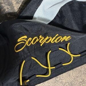 High-quality Scorpion Sports motorcycle riding set includes jacket (Large) and pants (Medium). Designed for maximum airflow and protection with durable mesh panels, yellow lace accents, and removable liners. Perfect for street or touring riders seeking comfort, safety, and standout style.