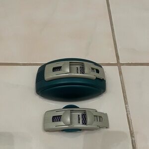 Uses the pre-cut tape strips, not included. The larger one is slightly heavy so great for gift wrapping & then the other one is a handband with a wall mount.