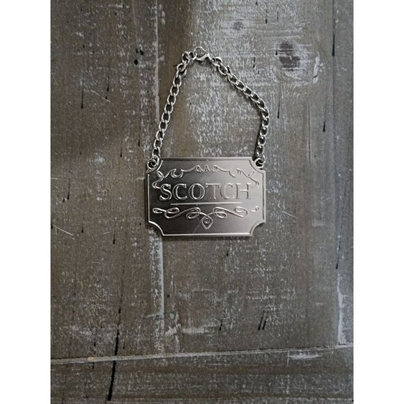This silver toned decanter label tag is designed for scotch bottles and features an elegant ornate engraving. It includes a chain for easy attachment.