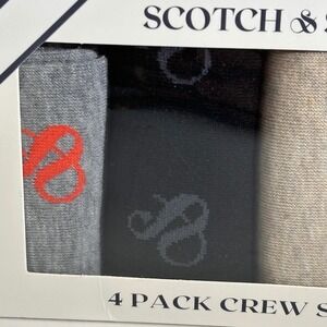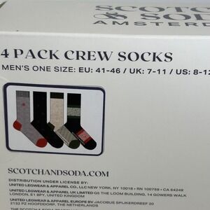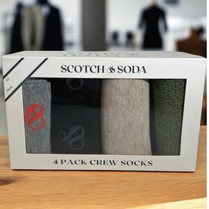 Keywords: Scotch & Soda, men's socks, crew socks, 4-pack, gift box, assorted colors, one size, designer socks, casual socks, stylish socks, comfortable socks, sock set, polyester blend