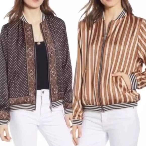 Stylish bomber jackets by Scotch & Soda. Features black and brown patterns. Perfect for casual wear.