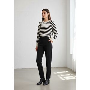 This classic black and white striped sweater is a versatile wardrobe staple. Made from a comfortable knit fabric, this crewneck pullover features a timeless horizontal stripe pattern and long sleeves. It is a perfect piece for creating a chic, effortless look for both casual and elevated occasions.