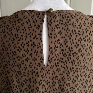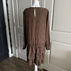 This dress is so fun and stylish! From preppy brand Scotch & Soda, this dress features a round neckline, shoulder epaulets, long sleeves, relaxed fit bodice, drop waist with elastic stretch, three-tiered ruffle mini skirt, keyhole opening at the back and slip on style. Brown fabric features a micro-leopard print in black, a perfect neutral. Excellent condition too!
