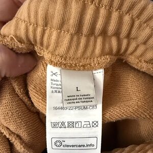 Stylish camel joggers with elastic waistband. Features drawstring and side pockets.
