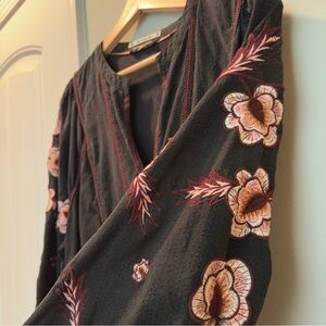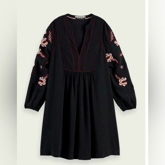 Boho-inspired black mini dress from Scotch & Soda featuring beautifully embroidered floral sleeves and red stitching along the front. Flowy, easy silhouette with elastic cuffs and soft textured fabric.