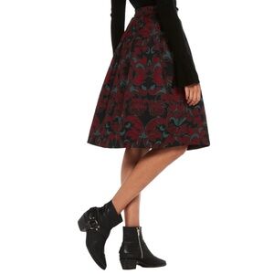 Scotch & Soda skirt, floral midi skirt, pleated A-line skirt, XS skirt, black red skirt, jacquard skirt, structured skirt, fall fashion, winter outfit, cocktail party outfit, Thanksgiving skirt, office holiday party outfit, vintage-inspired skirt, modest length skirt, European fashion, trendy mid-length skirt, dressy skirt, Thanksgiving dinner outfit, romantic dinner look, artsy feminine fashion, fall layers, holiday gathering skirt, work to weekend look, editorial style skirt, bold floral skirt, black base skirt, statement skirt, boho chic outfit